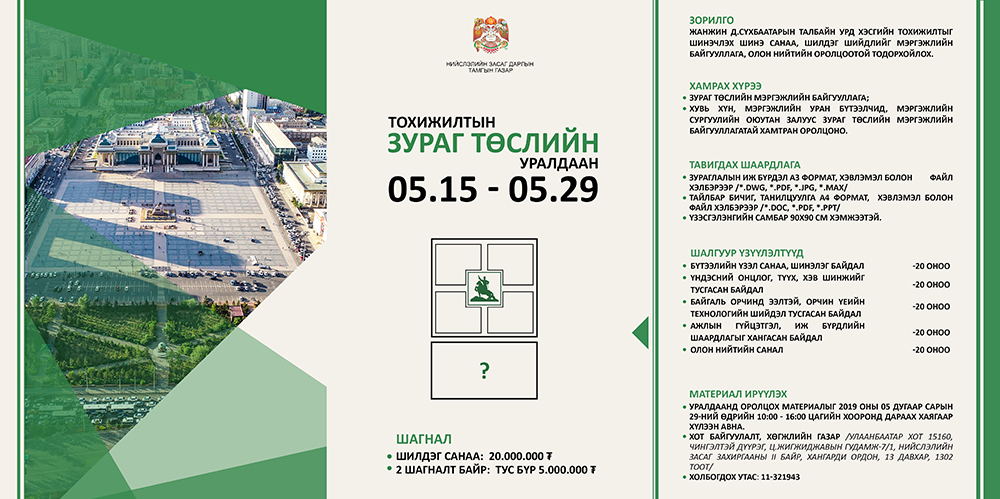 Жанжин Сүхбаатарын талбайн урд хэсгийн 2.5 га газарт тохижилтын ажлын зураг төсөл боловсруулах төслийн уралдаан зохион байгуулах тухай нийслэлийн Засаг даргын А/439 дүгээр захирамж гарлаа. Нийслэлийн төв талбайн урд хэсгийн тохижилтыг мэргэжлийн байгууллага, олон нийтийн оролцоотой шинэчлэх шинэ санаа, шилдэг шийдлийг тодорхойлж, бүтээн байгуулалт хийх зорилгоор 30 сая төгрөгийн шагналын сантай уралдаан зарлаж байна. Уралдаанд зураг төслийн мэргэжлийн байгууллагууд, хувь уран бүтээлчид, мэргэжлийн ангийн оюутнууд оролцох боломжтой. Тавдугаар сарын 15-наас 29 хүртэл буюу 14 хоногийн хугацаатай зарлагдаж буй уралдаанд оролцох хүсэлтэй уран бүтээлчид, аж ахуйн нэгжүүд бүтээлээ нийслэлийн төр, захиргааны байр “Хангарди” ордны 13 давхарт авчирч өгөх юм.