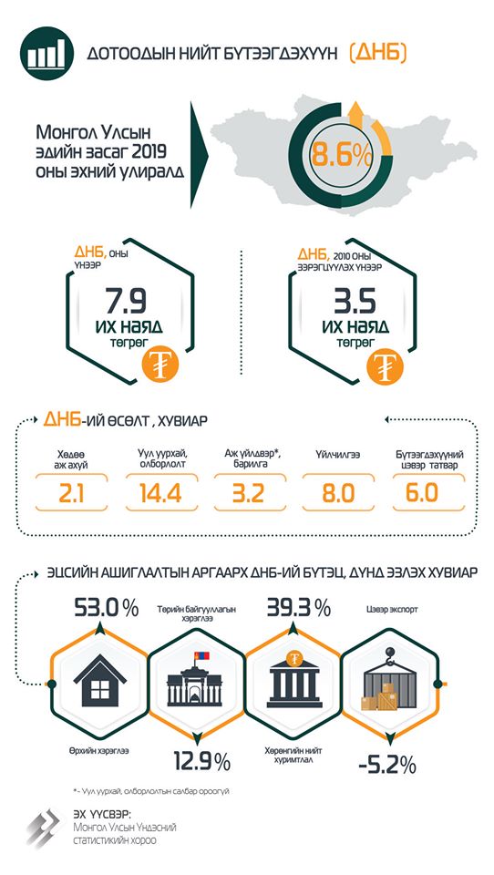 Манай улсын Дотоодын нийт бүтээгдэхүүн 2019 оны эхний улиралд урьдчилсан гүйцэтгэлээр 3.5 их наяд төгрөг болж, өмнөх оны мөн үеэс 279.9 тэрбум буюу 8.6 хувиар өслөө. Уг өсөлтөд үйлчилгээний салбарын нэмэгдэл өртөг 127.7 тэрбум төгрөг, аж үйлдвэр, барилгын салбарын нэмэгдэл өртөг 124.9 тэрбум төгрөгөөр өссөн нь голлон нөлөөлжээ.