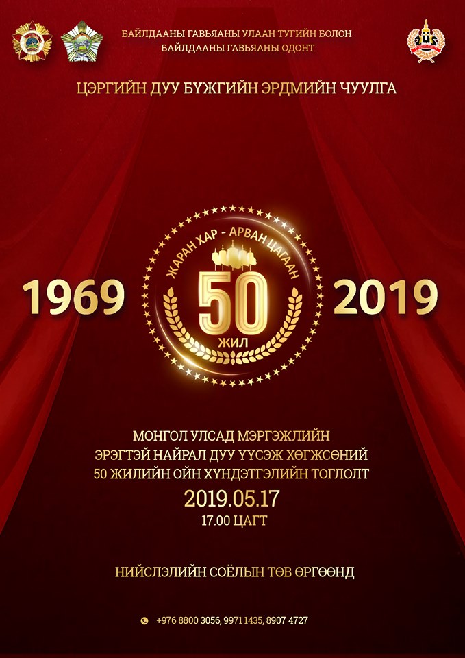 Монгол Улсад мэргэжлийн эрэгтэй найрал дуу үүсэж хөгжсөний 50 жилийн ой өнөөдөр /2019.05.17/ тохиож байна. Дайны хүнд бэрх жилүүдэд дуун аялгууг таслалгүй эгшиглүүлж чадсан ЦДБЭЧ-ын “Найрал дууны алба”-ны уран бүтээлчид 50 жилийн ололт амжилтаа бататгаж, үе үеийн найрал дуучиддаа хүндэтгэл үзүүлэх хүндэтгэлийн тоглолтоо өнөөдөр 17.00 цагт СТӨ-нд толилуулахаар болжээ. Хүндэтгэлийн тоглолтод МУАЖ Ө.Баярмагнай, МУГЖ Н.Отгон, МУГЖ Ч.Туул, МУГЖ Ж.Одмаа, МУГЖ Л.Батсүрэн, МУГЖ Ч.Баярмаа, МУГЖ Б.Батбаатар нар оролцохоос гадна ЦДБЭЧ-ын үе үеийн гоцлол болон найрал дуучид, эстрад симфони найрал хөгжимчид бүжигчид ЗХЖШ-ын үлгэр жишээ үлээвэр найрал хөгжим, урлагийн их дээд сургуулиуд, монголын мэргэжлийн урлагийн байгууллагуудын найрал дуучид оролцох юм.