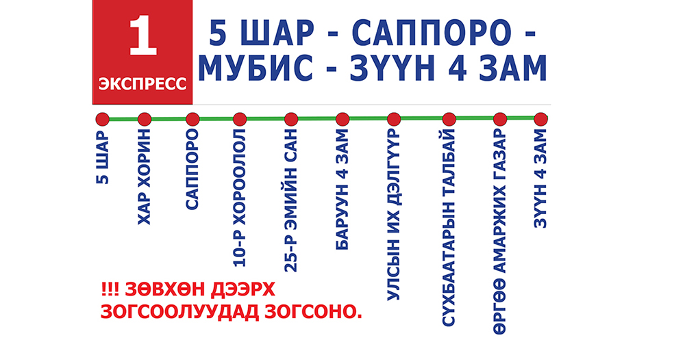 “Экспресс чиглэлд явж байгаа автобусыг яаж ялгах юм бол” гэж зорчигч та асуух гэж байна уу. “Экспресс 1: Таван шар-Саппоро-МУБИС-Зүүн дөрвөн зам”, “Экспресс 2: Таван шар-Саппоро-Бөмбөгөр-МУИС-Хөгжим бүжиг”, “Экспресс 3: Зунжин-7 буудал-Ард кино театр-120 мянгат” гэсэн том улаан бичигтэй хаягийг урдаа болон хажуудаа хадсан байгаа шүү.