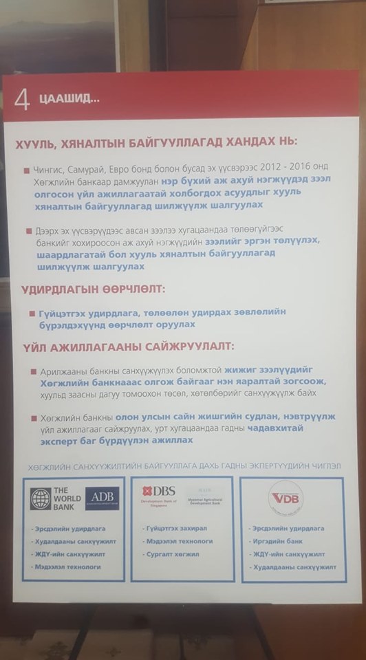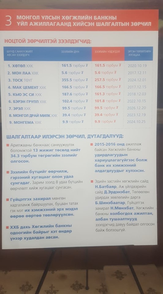 Монгол Улсын Хөгжлийн банкинд хийсэн шалгалтын дүнг ЗГХЭГ-ын дарга Л.Оюун-Эрдэнэ танилцууллаа. Хөгжлийн банк олон улсад бонд гаргах замаар хөрөнгө босгож улс орны хөгжлийг тодорхойлох томоохон дэд бүтэц, хөрөнгө оруулалтын төслүүдийг санхүүжүүлэх чиг үүрэгтэй ажилладаг.