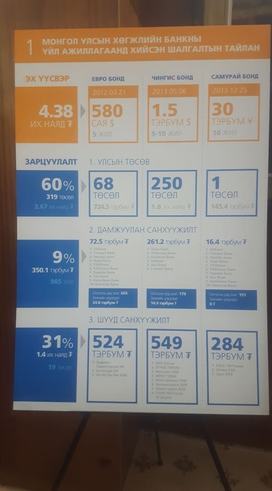 Хөгжлийн банк “Евро” бондын 580 сая ам.доллар, “Чингис” бондын 1.5 тэрбум ам.доллар, “Самурай” бондын 30 тэрбум иений хөрөнгө төвлөрүүлсэн боловч үр дүнгүй зарцуулсан болох нь шалгалтаар тогтоогдсон байна. Нийт бондын хөрөнгийн 60 хувь нь улсын төсөвт орсон бол Хөгжлийн банкнаас 319 төсөл хөтөлбөрт 1.8 их наяд төгрөгийн санхүүжилт хийсэн байна. Шалгалтын явцад томоохон мөнгөн дүн бүхий олон төсөл хөтөлбөрийг нэгтгэж дүгнэсэн учраас сар гаруй хугацаанд ажлын хэсэг ажилласан болохыг Л.Оюун-Эрдэнэ сайд хэлж байлаа. Тэрбээр “Хөгжлийн банкны санхүүжүүлсэн төслүүдэд МИАТ-ын онгоц авах зэрэг ашигтай төслүүд байгаа. Гэтэл Монгол Улсын эдийн засагт асар их дарамт болсон төслүүд байна. Эргэн төлөгдөх нөхцөлгүй төслүүдэд бондын хөрөнгийг зарцуулаад яваад байх нь хүндрэлтэй. Хэрэв энэ байдлаараа удаан явбал Монгол Улс дампуурлаа зарлах байдал ойрхон байсан гэдгийг хэлмээр байна. Тиймээс энэ үйлдлүүддээ сургамж авч ажиллахгүй бол болохгүй нь” гэсэн юм.
