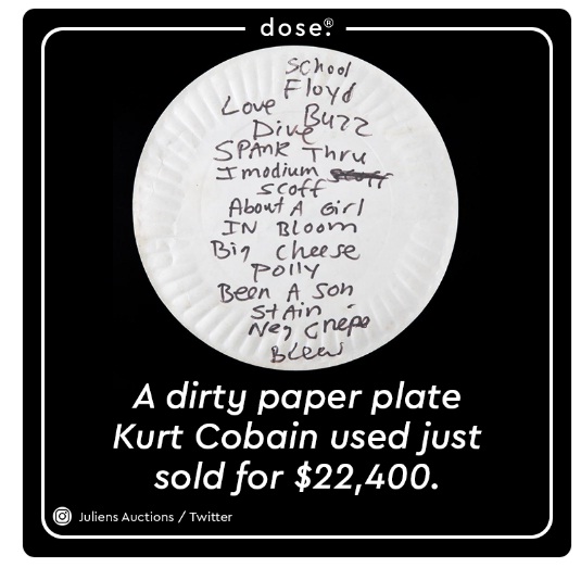 “Nirvana” хамтлагийн ахлагч Курт Кобейний 1990 оны дөрөвдүгээр сарын 23-нд Вашингтон хотод пицца идсэн цаасан тавгийг Калифорнид дуудлагаар худалдааллаа. Пиццаны хэлтэрхий наалдсан энэхүү таваг 22,4 мянган долларын үнэ хүрсэн байна.