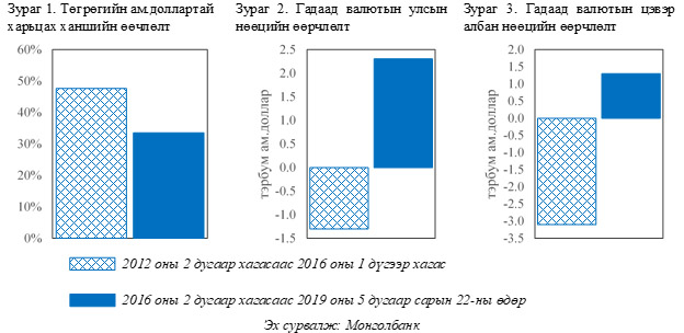 Валютын зах дахь дарамт өндөр байсан 2013-2014 онд Монголбанкнаас жилд 2.3-3 тэрбум буюу хоёрхон жилийн дотор тав гаруй тэрбум ам.долларыг захад нийлүүлж байсан ч 2013 онд төгрөгийн ам.доллартай харьцах ханш 19 хувь, 2014 онд 14 хувиар суларч байв. Харин сүүлийн жилүүдэд Монголбанкнаас төгрөгийн ханшийг эдийн засгийн суурь нөхцөлтэй нийцтэйгээр огцом хэлбэлзлийг нь бууруулах, гадаад валютын нөөцийг нэмэгдүүлэх бодлогыг нэгэн зэрэг амжилттай хэрэгжүүлж байгааг энэхүү зургаас харж болно.