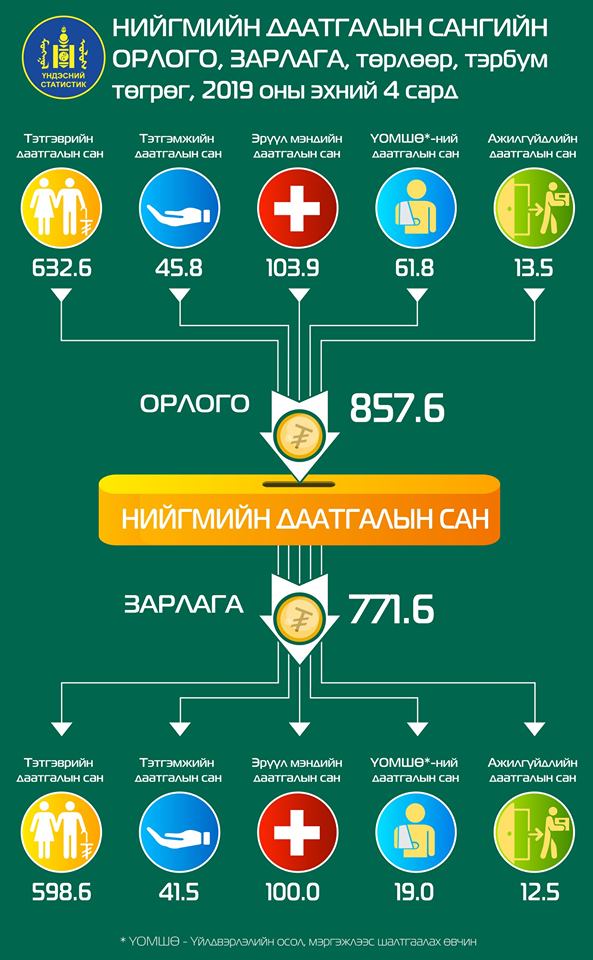 Нийгмийн даатгалын ерөнхий газар болон Эрүүл мэндийн даатгалын ерөнхий газрын мэдээллээр нийгмийн даатгалын сангийн орлого энэ оны эхний дөрвөн сард 857.6 тэрбум төгрөг болж, өмнөх оны мөн үеэс 137.5 тэрбум төгрөгөөр өслөө. Харин зарлага 771.6 тэрбум төгрөг болж, өмнөх оны мөн үеэс 91.9 тэрбум төгрөгөөр өсөв.