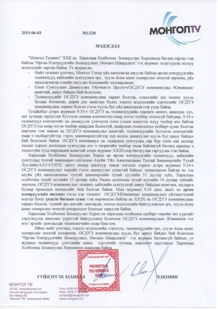 Харилцаа Холбооны Зохицуулах Хорооноос батлан гаргах гэж байгаа “Өргөн Нэвтрүүлгийн Зохицуулалт, Нөхцөл Шаардлага” гэх журманд оруулсан зүйл заалтыг Монгол HDTV эсэргүүцсэн мэдэгдэлийг өчигдөр /2019.06.03/ гаргалаа.