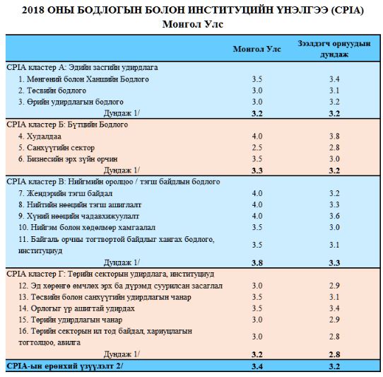 2018 оны бодлогын болон институцийн үнэлгээний үр дүнгээр Монгол Улс 3.4 гэсэн үнэлгээ авч, үнэлгээ хийгдсэн улсуудын дундаж (3.2)-аас өндөр, өмнөх хоёр жилээс үргэлжлэн сайжирсан дүн гарлаа. Манай улсын хувд тус үнэлгээ 2017 онд 3.3, 2016 онд 3.2 байв.