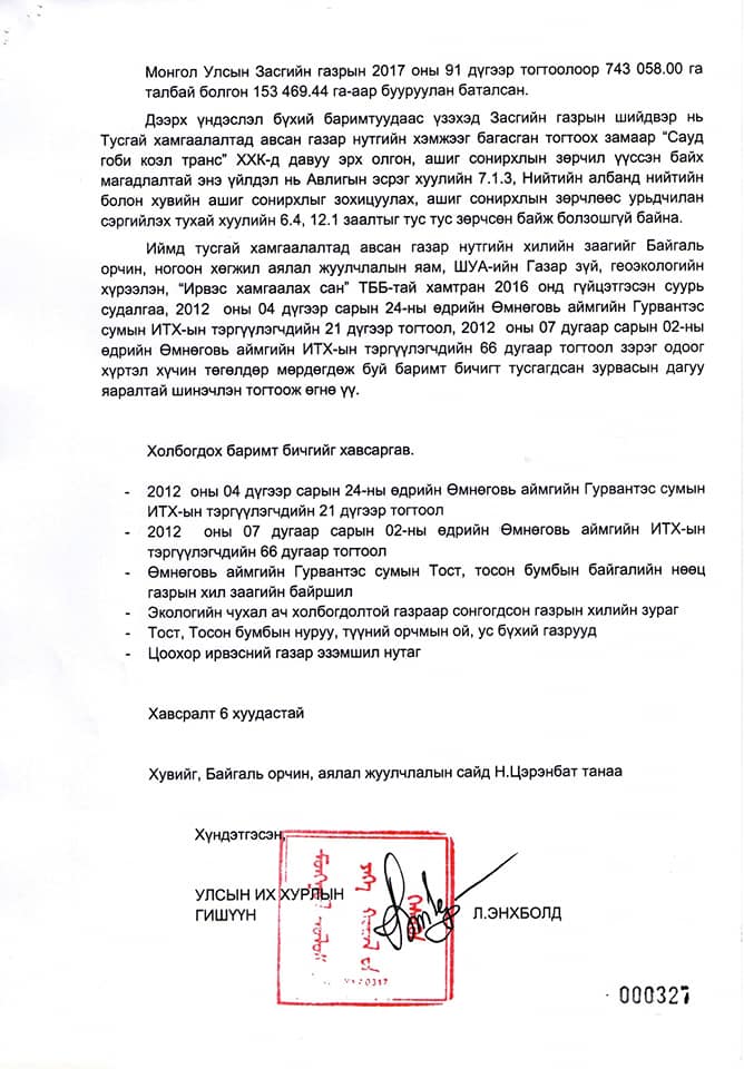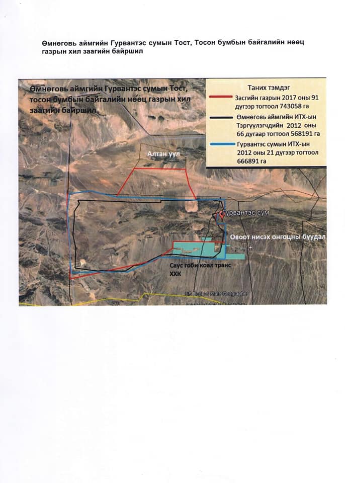 Тиймээс тусгай хамгаалалтад авсан газар нутгийн хилийн заагийг Байгаль орчин, ногоон хөгжил аялал жуулчлалын яам, ШУА-ийн Газар зүй, геоэкологийн хүрээлэн, "Ирвэс хамгаалах сан" ТББ-тай хамтран 2016 онд гүйцэтгэсэн суурь судалгаа, 2012 оны 04 дүгээр сарын 24-ны өдрийн Өмнөговь аймгийн Гурвантэс сумын ИХТ-ын тэргүүлэгчдийн 21 дүгээр тогтоол, 2012 оны 7 дугаар сарын 2-ны өдрийн Өмнөговь аймгийн ИТХ-ын тэргүүлэгчдийн 66 дугаар тогтоол зэрэг одоог хүртэл хүчин төгөлдөр мөрдөгдөж буй баримт тусгагдсан зурвасын дагуу яаралтай шинэчлэн тогтоож өгөхийг Засгийн газраас хүссэн байна.