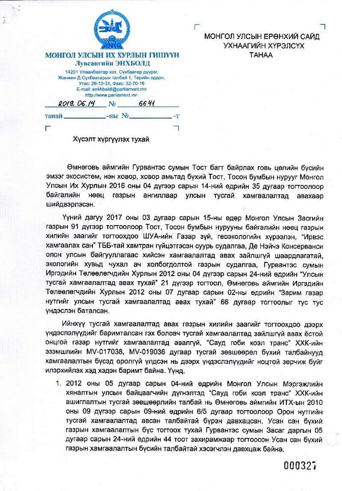 УИХ--ын гишүүн Л.Энхболд Өмнөговь аймгийн Гурвантэс суманд байрлах Тост, Тосон бумбын нурууны орчмын хилийн зурвасын хэмжээг дахин тогтоолгох хүсэлтийг Ерөнхий сайд У.Хүрэлсүх, Байгаль орчин, аялал жуулчлалын сайд Н.Цэрэнбат нарт өнөөдөр хүргүүллээ.