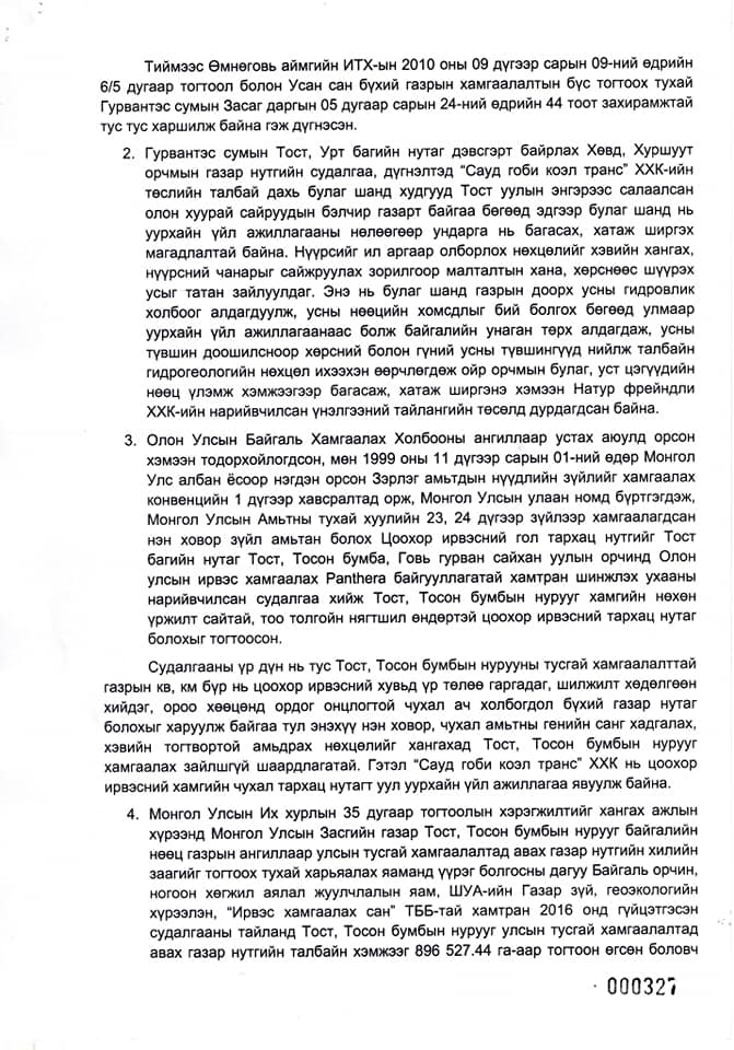 Гэвч ийнхүү тусгай хамгаалалтад авах газрын хилийн заагийг тогтоохдоо дээрх үндэслэлүүдийг баримталсан гэх боловч зайлшгүй хамгаалалтад авах ёстой онцгой газар нутаг буюу "Сауд гоби коэл транс" ХХК-ийн эзэмшлийн MV-017038, MV-019036 дугаар тусгай зөвшөөрөл бүхий талбайг хилийн цэсийн гадна үлдээсэн баримтуудыг УИХ-ын гишүүн Л.Энхболд хүсэлтдээ дурдсан байна. Тодруулбал, Засгийн газрын 2017 оны 91 дүгээр тогтоолоор Тост, тосон бумбын нурууг Тусгай хамгаалалтад авахдаа газар нутгийн хэмжээг багасган тогтоосон бөгөөд энэ үйлдэл нь "Сауд гоби коэл транс" ХХК-д давуу эрх олгон, ашиг сонирхлын зөрчил үүссэн байх магадлалтай. Авлигын эсрэг хууль, Нийтийн албанд нийтийн болон хувийн ашиг сонирхлыг зохицуулах, ашиг сонирхлоос зөрчлөөс урьдчилан сэргийлэх тухай хуулийн холбогдох заалтуудыг тус тус зөрчсөн байж болзошгүй хэмээн онцолжээ.