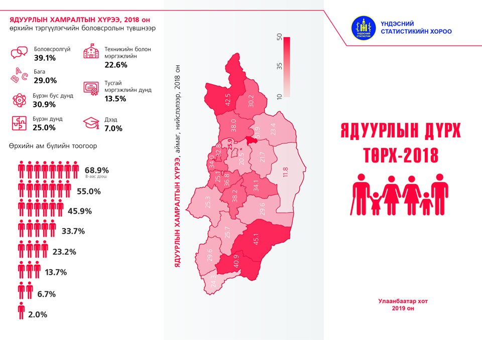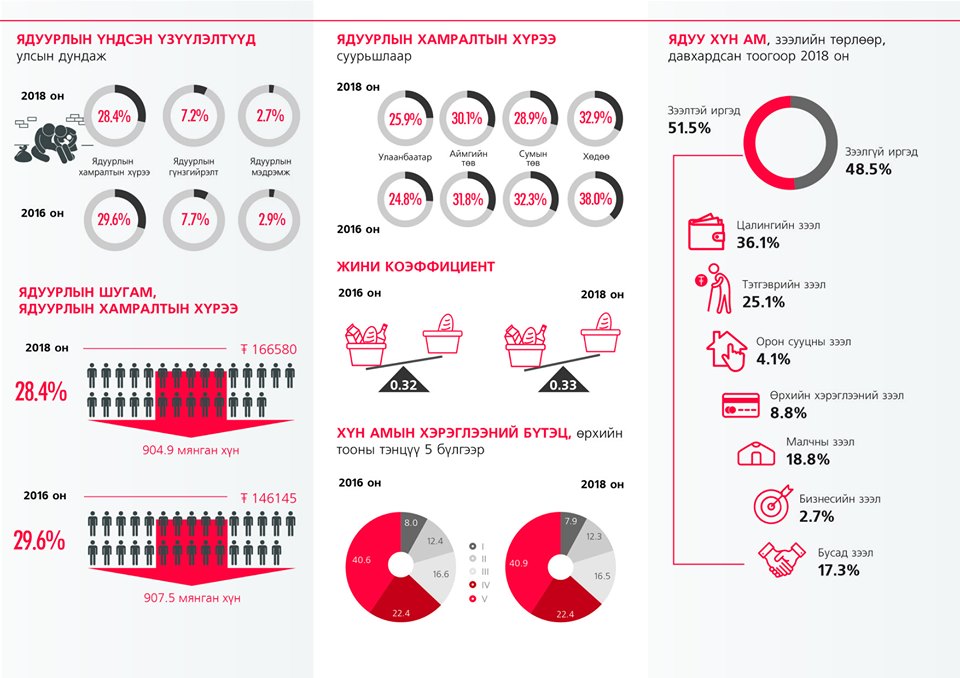 Үндэсний статистикийн хороо болон Дэлхийн банкны хамтран тооцсон ядуурлын тооцооны үр дүнгээр Монгол Улсын хүн амын ядуурлын түвшин 2016 онд 29.6 хувь байсан бол 2018 онд 28.4 хувь болж, 1.2 пунктээр буурчээ.