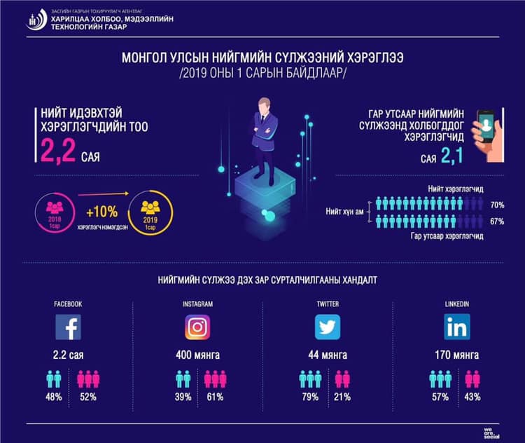 Монгол Улсын нийгмийн сүлжээний хэрэглээ энэ оны нэгдүгээр сарын байдлаар ямар байгааг хүргэе. Нийт идэвхтэй хэрэглэгчдийн тоо 2.2 сая бол 2.1 сая нь гар утсаар нийгмийн сүлжээнд холбогддог аж.