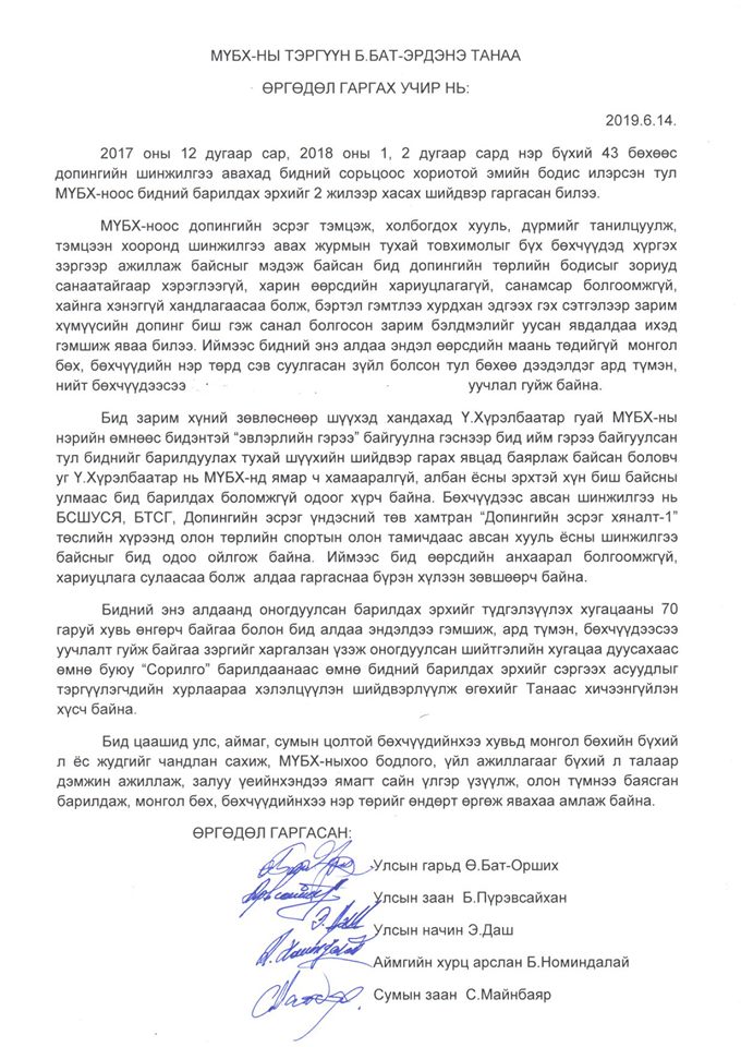 Бөхчүүдийн эрхийг сэргээсэн эл шийдвэр өнгөрсөн ням гаригт /2019.06.23/ “Наадмын сорилго” барилдааны үеэр бөхчүүдийн эсэргүүцэлтэй тулж, улсын аварга Ч.Санжаадамба тэргүүтэй зааланд цугласан бүх бөхчүүд “Нэг бол бөхчүүдээ барилдуул, аль эсвэл эрхийг нь сэргээсэн бөхчүүдээ барилдуул. Бид үүгээрээ допингийн эсрэг гэдгээ илэрхийлж байна” гэсэн шаардлага тавьсан.