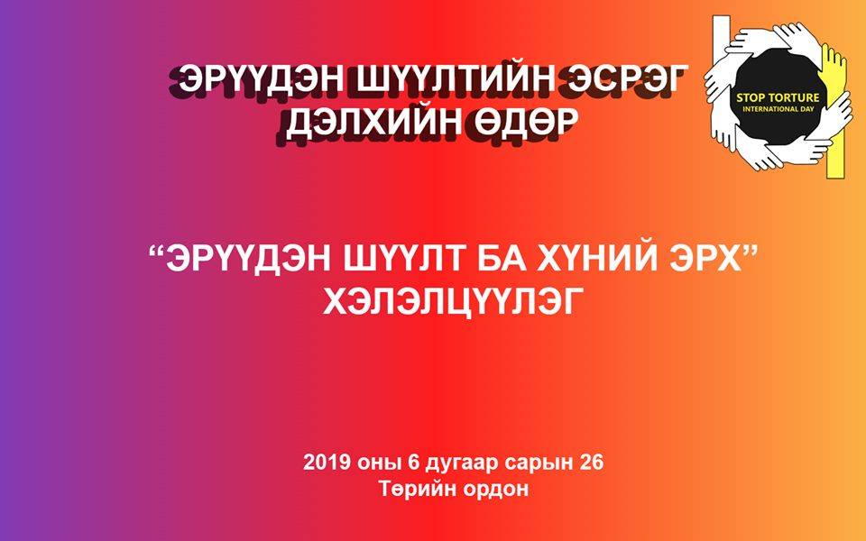 Төрийн ордонд лхагва гарагт "Эрүүдэн шүүлт ба хүний эрх" сэдэвт хэлэлцүүлгийг зохион байгуулах гэж байна. Энэхүү хэлэлцүүлгийг НҮБ-ын Эрүүдэн шүүлтийн эсрэг өдрийг тохиолдуулан зохион байгуулж байгаагаараа онцлогтой аж.