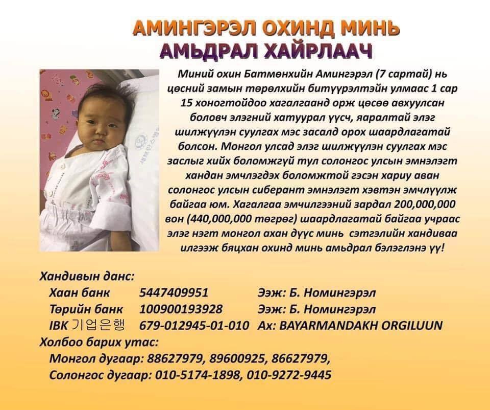 Хагалгаа, эмчилгээний зардал нь 200.000.000 вон /440.000.000 төгрөг/ шаардлагатай учраас элэг нэгт монголчууддаа хандаж байгаа юм.