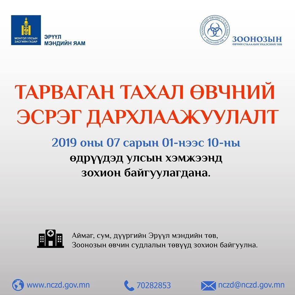 “Тарваган тахал өвчний эсрэг дархлаажуулалтын 10 хоног”-ийг өнөөдрөөс эхлэн улсын хэмжээнд зохион байгуулж байна. Энэ хүрээнд хөдөө орон нутгийн 21 аймгийн эрүүл мэндийн газар, нийслэлийн есөн дүүргийн эрүүл мэндийн төвд нийт 32.400 хүн тун вакциныг хүргүүлсэн байна.