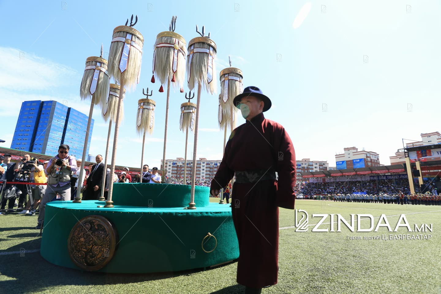 Өнөөгийн Та бидэнд тусгаар тогтнол, түүх соёлоо ямагт зүрхэн толт, нүдний цэцгий мэт эрхэмлэн хайрлаж явах түүхэн үүрэг буйг Монгол наадам маань сануулж байна. Бүрэн эрхт, тусгаар Монгол Улс байгаа цагт үндэсний их баяр наадам маань мөнх орших болно. Их эзэн, эцэг дээдэс Чингис хаан минь ээ. Хүлэг морьд чинь хурдан байна, хүчит бөхчүүд чинь мэхтэй байна, харваачид чинь мэргэн байна. Эх нутаг, элгэн садан монголчуудаа үеийн үед дээд тэнгэрээс ивээгээрэй. Мөнх тэнгэрийн ивээл дор Монгол наадам эхэллээ” гэв.