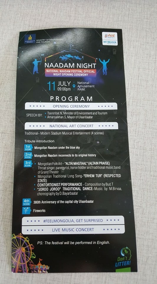 “Naadam night” тоглолтын тасалбар 20-35 мянган төгрөгөөр худалдаалагдаж байна. Гадаадын жуулчдад зориулсан энэхүү арга хэмжээг Байгаль орчин, аялал жуулчлалын яамнаас санаачлан, санхүү хөрөнгийг нь шийджээ.
