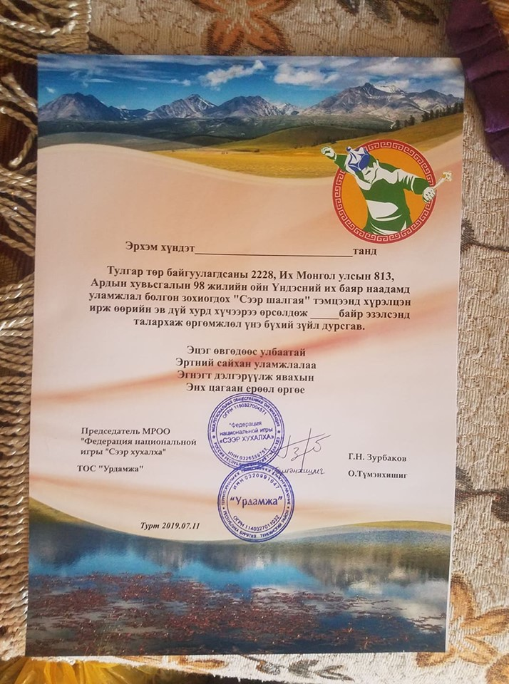 Тулгар төр байгуулагдсаны 2228, Их Монгол Улс байгуулагдсаны 813, Ардын хувьсгалын 98 жилийн Үндэсний их баяр наадамд зориулан Хөвсгөл аймагт “Сээр шалгая” тэмцээнийг амжилттай зохион байгуулжээ. Ханх сумд болсон энэхүү тэмцээнд нийт 25 хүн оролцсон байна. Монгол эрчүүдийн эр бяр, эв дүйг шалгадаг энэхүү тэмцээнд халх, буриад, баяд, дөрвөд гээд Монголын бүхий л ястан ирж оролцдог билээ.