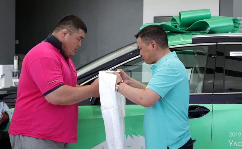 Ардын хувьсгалын 98 жилийн ойн Үндэсний их баяр наадамд түрүүлсэн, Улсын аварга Э.Оюунболдын гэр бүлд түүний харьяалагддаг “Алтай констракшн” ХХК будаг нь ханхалсан "Lexus RX350" авто машин бэлэглэж, аварга цолыг нь мялаалаа.