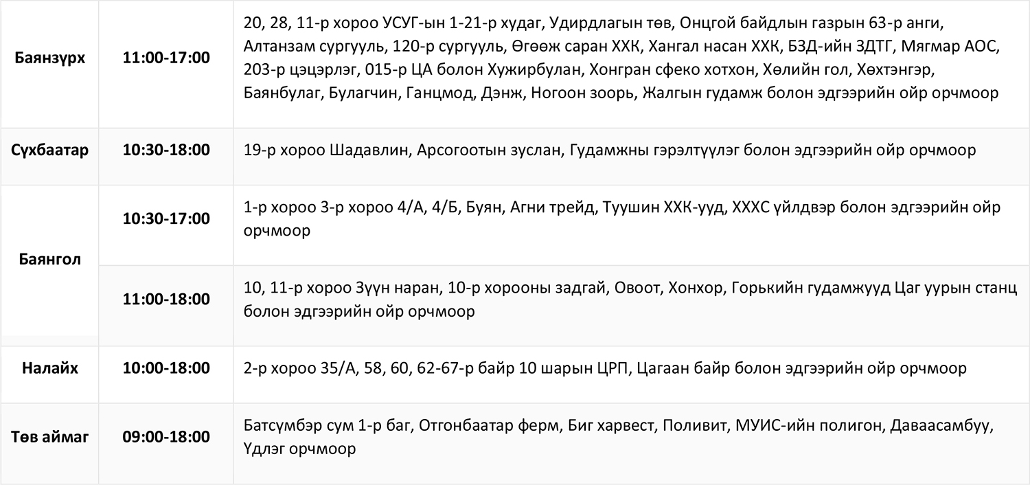 Цахилгаан эрчим хүчээр түр хязгаарлагдах хэрэглэгчдийг байршлаар нь баримжаалан жагсааж байгааг анхаарна уу.