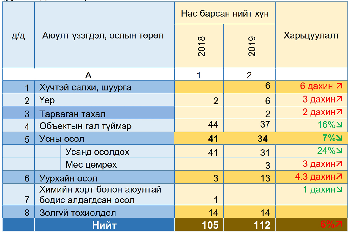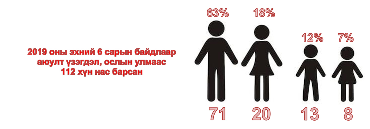 Нас баралт: 2019 оны эхний 6 сарын байдлаар нийт 112 хүн нас барсан нь өмнөх оны мөн үетэй харьцуулахад 6%-аар өссөн байна.
