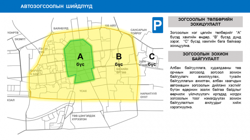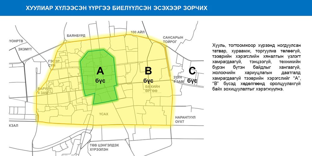 Тэгвэл өнөөгийн хотын удирдлагууд замын хөдөлгөөнийг “А”, “В”, “С” гэсэн гурван бүсчлэлд хуваахаар ажиллаж байна. Өөрөөр хэлбэл, “А” бүс нь бага талбайг хамрах бөгөөд Багшийн дээдээс Цэцэг төвийн уулзвар хүртэлх аж. Харин “Б” бүс нь Их тойруу, Баянбүрд, 100 айл, Баруун дөрвөн замаас Зүүн дөрвөн зам хүртэл бол “С” бүс нь дээр дурдсанаас гадуур хэсэг.