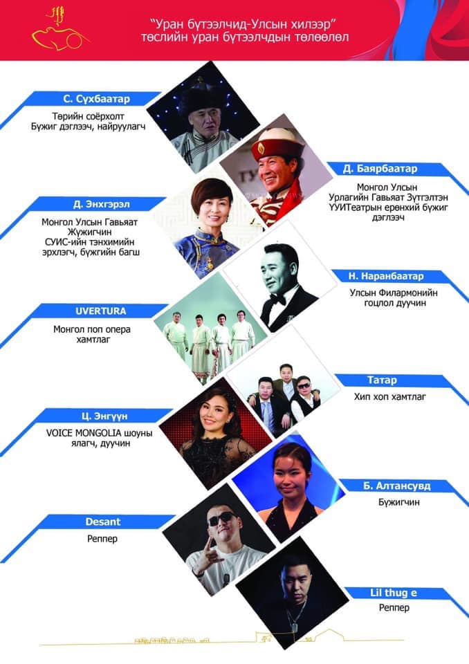Аялалд зураач, хөгжмийн зохиолч, бүжигчин, зохиолч, яруу найрагч, дуучин, түүхч судлаач, фото зурагчин, нийтлэлч сэтгүүлч, контемпорари урлаг зэрэг соёл урлагийн 15 салбарын 120-150 мэргэжлийн уран бүтээлчид эх орныхоо хязгаар нутгуудаар 75 хоногийн хугацаанд аялж бүтээгч уран бүтээлчид өөрсдийн оюун ухаан, ур чадвар сэтгэлгээгээрээ уран бүтээл туурвиж Монгол Улсын Засгийн газарт хүлээлгэн өгөх бол гүйцэтгэгч уран бүтээлчид аяллын явцад алслагдсан хил хязгаарын ард иргэд болон хилийн цэргийн бие бүрэлдэхүүнд урлаг соёлын үйлчилгээ үзүүлнэ.