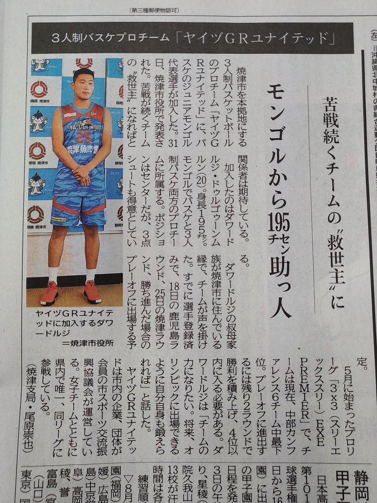 “YAIZU GR UNITED” баг 3x3 сагсан бөмбөгийн мэргэжлийн “EXE PREMIER” лигийн Төвийн бүсийн хамгийн сүүлийн байрт явж байна. Плей-оффт шалгарахын тулд сүүлийн хоёр үед сайн тоглох шаардлагатай. Манай тамирчин энэ сарын 18-нд Кагошимад болох тэмцээнээс тоглож эхлэн, 25-нд эхлэх Яйзү тэмцээнд оролцоно.