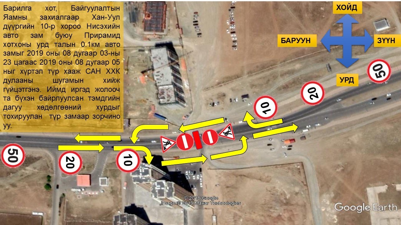 Тодруулбал наймдугаар сарын 03-ны өдрийн 23 цагаас 08 дугаар сарын 05-ны өдөр хүртэл түр хааж дулааны шугамын ажлыг хийж гүйцэтгэнэ гэдгийг Тээврийн цагдаагийн албанаас мэдээллээ. Иймд тус чиглэлд зорчих иргэд байршуулсан тэмдгийн дагуу түр замаар хөдөлгөөнд оролцохыг Тээврийн цагдаагийн албанаас зөвлөж байна.