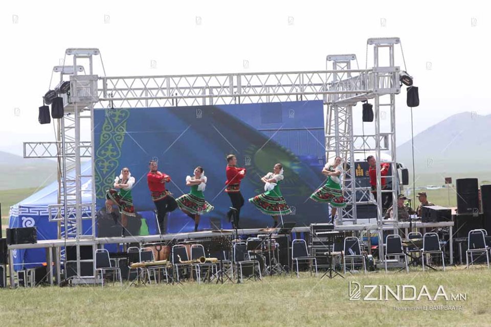 Нээлтийн индэр урд жигүүрт засагдаж зочид төлөөлөгчид хойд жигүүрт зассан суудал болоод асрыг эзэгнэн тухалсан байлаа. Зүүн жигүүрт эгнэн ярайсан орон орны цэргүүд зүс ижил харагдаж байгаа нь сонирхол татаж байв. Баруун жигүүрт тамирчдын ар гэр, найз нөхөд төдийгүй нээлтийн арга хэмжээг үзэхээр зорин ирсэн ард иргэд дүүрэн байлаа. Харин хойд дэнжид дөрвөн цагаан гэрийг эгнүүлэн босгожээ. Хамгийн баруун гэрт “Монгол цэргийн музей”-н сан хөмрөгөөс дэлгэн харуулсан байв. Монголын эзэнт гүрний байлдан дагууллын үеийн газар нутгийн зураг, цэрэг зэвсгийн бүтэц, зохион байгуулалтыг харуулсан зураг болон хөө хуяг малгай, дуулга, нум сум, хоромсог саадаг тэргүүтнээс эхлээд дайн байлдааны үед хэрэглэж байсан гар буу, төөнүүр буу, цахиур буу, винтов, монгол цэргийн гар хийцийн эмээл, тохош, богц, дөрөө, тах гээд морин цэргийн эдлэл хэрэглэлийг дэлгэн үзүүлжээ. Мөн 1938 оны Бригад командлан захирагчийн дүрэмт хувцас, 1944-1952 оны хооронд Маршал Х.Чойбалсангийн өмсөж байсан цэргийн дүрэмт хувцсыг хойморт байрлуулжээ. Удаах гэрт Ахмад дайчин Н.Чинбат 50 гаруй жил цуглуулсан ил захидал, дугтуй, марк тэмдэг зэрэг арвин баялаг сангаасаа дэлгэн үзүүлсэн нь олны анхаарлыг татсан зүйл байв. Үүнээс сорчилж Чингис хааны үеийн байлдан дагуулал, морин цэргийн холбоотой цуглуулгаа нямбайлан өрсөн байлаа. Гурав дахь гэрт хүлээлгийн өрөө буюу амралтын өрөө, сүүлийн гэрт түргэн үйлчилгээний цэг байрлуулжээ.