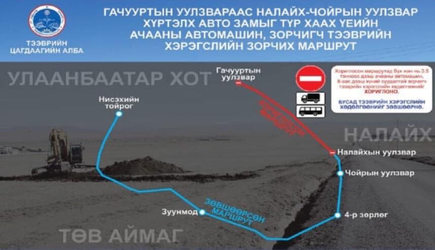 Иймд иргэд, жолооч та бүхэн зам хаалттай байх хугацаанд Төв аймаг, 4-р зөрлөг маршрутаар тойрч, замын хөдөлгөөндөө оролцоно уу.