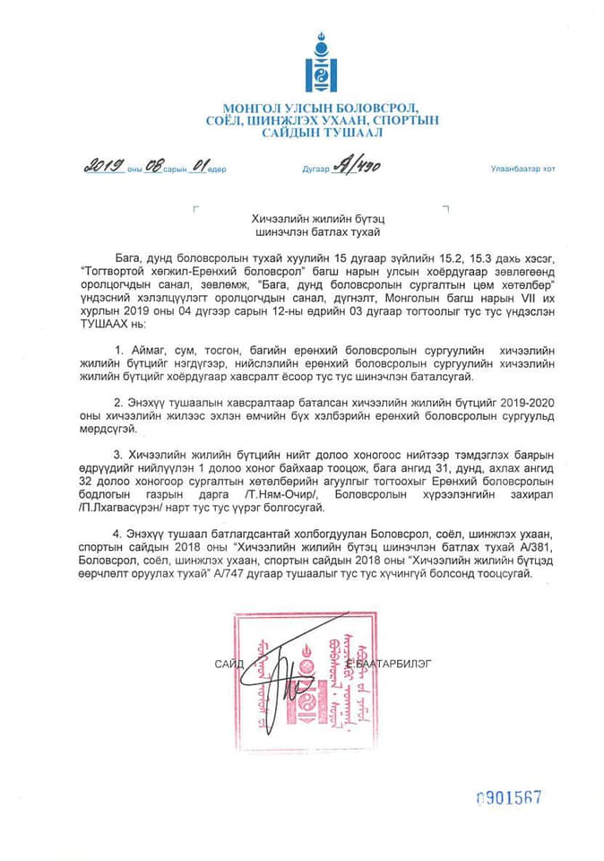 Монгол Улсын Боловсрол, Соёл, Шинжлэх ухаан, Спортын сайдын 2019 оны наймдугаар сарын 1-ний өдрийн тушаалаар энэ хичээлийн шинэ жилийн бүтцийг шинэчлэн баталжээ.