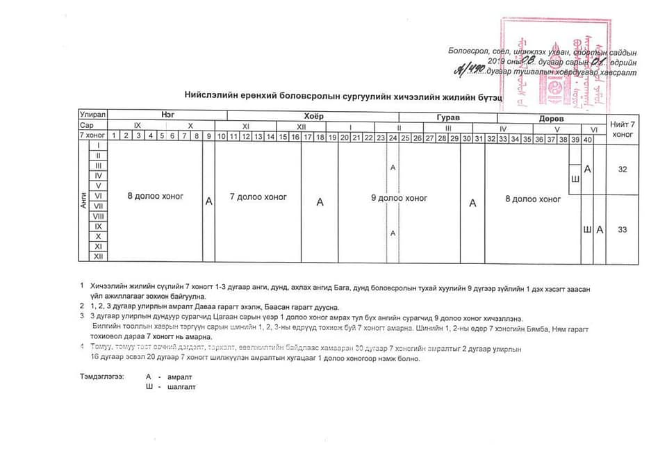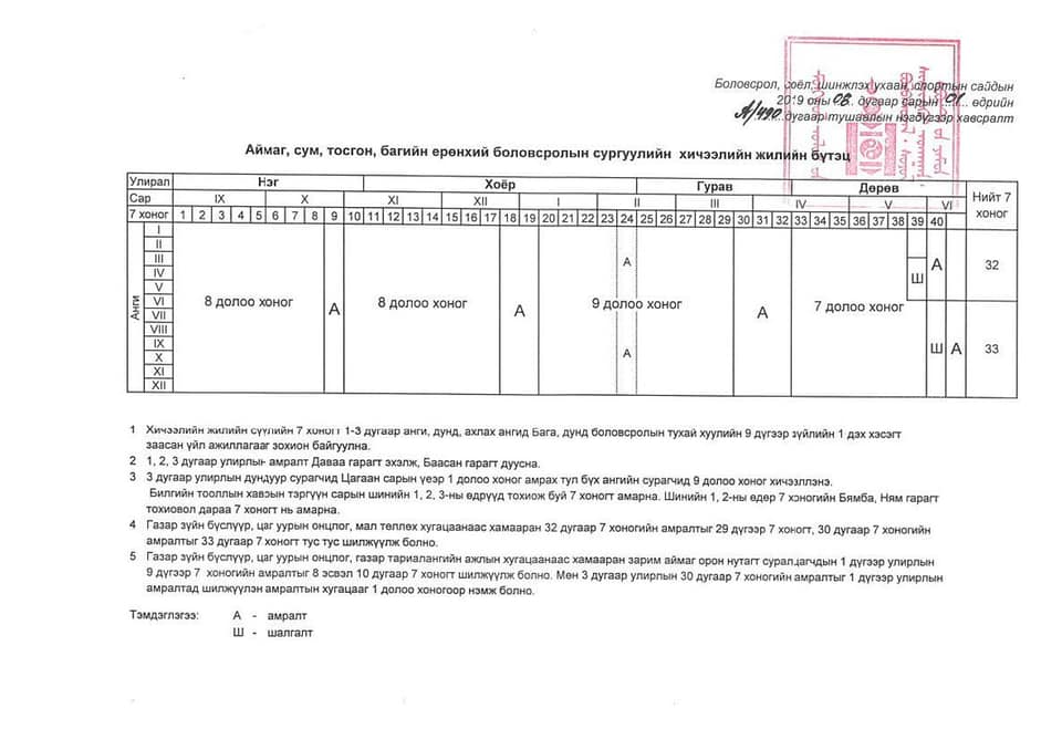 2019-2020 оны хичээлийн жилд бага ангийн сурагчид 31 долоо хоног, дунд болон ахлах ангийн сурагчид 32 долоо хоног хичээллэх ба үүний долоон долоо хоног нь улирлын амралт байх аж.