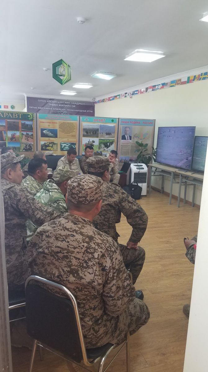 Тэмцээний сүүлийн өдөр тэнгэр бүрхэг сэрүүвтэр байлаа. Хамгийн сүүлд ОХУ-ны баг тамирчид богинын зайд гараанаас гарч, үүрэг гүйцэтгэж, барианд цугларсан цэргийн командлагч нар болон зочид төлөөлөгч, үзэгч олон, хэвлэл мэдээллийн ажилтнууд тэднийг халуун баяртайгаар угтан авлаа. Морьдынхоо амгайг татан дүүхэлзэх тамирчдын тасгийн дарга, ахлах түрүүч Сагды Сержанаас сэтгэгдлийг нь сонсоход “Холын зайнд амжилттай үүрэг гүйцэтгэсэн. Ойрын зайд кранат шидэх, гүйх нь хүнд байлаа” гэлээ. Тэмцээний дүн цагийн дараа гарна гэдгийг албаны хүнээс сонсоод, хэвлэлийн ажилтнуудын өрөө рүү орж мэдээгээ шуурхай оруулчихаад эргэн тойроо ажиглав. Энэ тэмцээний зохион байгуулалтад 300 гаруй албан хаагч ажиллаж байгаа аж. Толгой өөд татах завгүй ажиллах хэвлэл мэдээллийн ажилтнууд цаг минут алдалгүй мэдээ орчуулан хүргэж, орос, монголоор ярилцан, бичиг цаас барин нааш цааш барин гүйлдэх агаад дарга нар нь доод албан тушаалтнууддаа үүрэг өгч, захиран командалж байх нь содон. Тэмцээний үйл явцыг газар дээрээс нь шууд дамжуулах өндөр хүчин чадалтай станц бүхий Команд штабтай танилцав. Нэг давхарт нь шүүгчдийн бүрэлдэхүүн шууд дамжуулалтыг дөрвөн том дэлгэцээр хянаж байв. Баг тамирчдыг шүүгч, хүний эмч, малын эмч, агтач, орчуулагч, сурвалжлагч, жолооч гээд төрөл мэргэжлийн алба хаагчид дагалдан ажиллаж байна. Мөн МҮОНРТ-ийн хамт олон цэгүүдэд ажиллаж байгаа юм. Шүүгчид тэднийг болон тамирчдын үйлдэл, гүйцэтгэл хөдөлгөөн бүрийг хянан ажиллаж, тэмцээнийг шударга шүүхийн төлөө нүд цавчилгүй ажиглаж байв. Мөн хажуугийн том дэлгэц бүхий хурлын өрөөнд тэмцээн бүрийн дараа ОХУ-тай холбогдон онлайн хурал хийдэг ажээ. Тамирчдын аюулгүй байдлыг хангах хүрээнд баг бүрт зүг чиг заагч буюу GPS суулгасан бөгөөд Холбооны өрөөнд дроноор авч буй камерын бичлэг болон холбоо техникийн аюулгүй байдлыг хянах Дэд хурандаа М.Батхуяг тэргүүтэй баг бүрэлдэхүүн ажиллана.