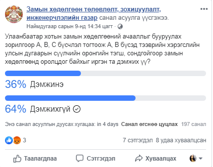 А болон В бүс рүү татвараа төлсөн, торгуульгүй, өнгө үзэмж сайтай, техникийн улсын үзлэгт тэнцсэн автомашинуудыг нэвтрүүлэхээр төлөвлөж байсан юм. Тэгвэл A, B, C бүсчлэлд хуваах төслийн талаар санал асуулга явуулахад иргэдийн 36% дэмжиж, 64% дэмжээгүй учраас иргэдийн саналын харгалзан төлөвлөж байсан ажлыг тодорхой хугацаагаар хойшлуулсан байна.