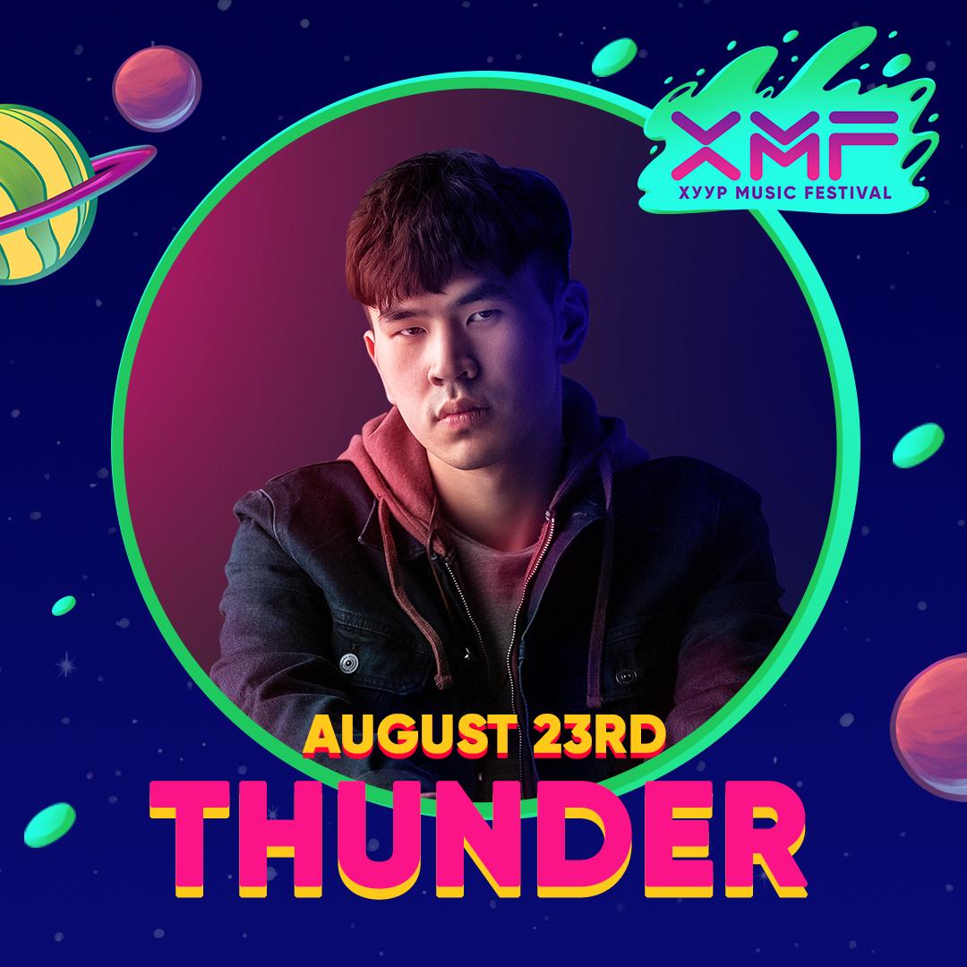 XMF –ийн тайзнаа бидэнтэй цуг байх дараагийн уран бүтээлч бол реппер Thunder. Түүнийг хүүхэд залуус анх Реп дэмбээ хэмээх гудамжны дисс тэмцээнээс нь мэдэх биз ээ. Хожим нь тэрээр Backyard хэмээх тэмцээний ялагчаар тодорч уран бүтээлийнх нь гараа эхэлсэн гэхэд болох юм. Тэрээр үгэлж залуучуудыг сайнд уриалсан, эерэг хандлага бэлэглэсэн уран бүтээлүүдээрээ түүчээлдэг нэгэн. Тиймээс ч залуучуудын дунд нилээд ритинг өндөртэй репперүүдийн нэг болон гарч ирээд байгаа юм.