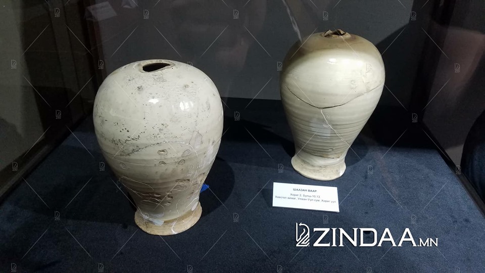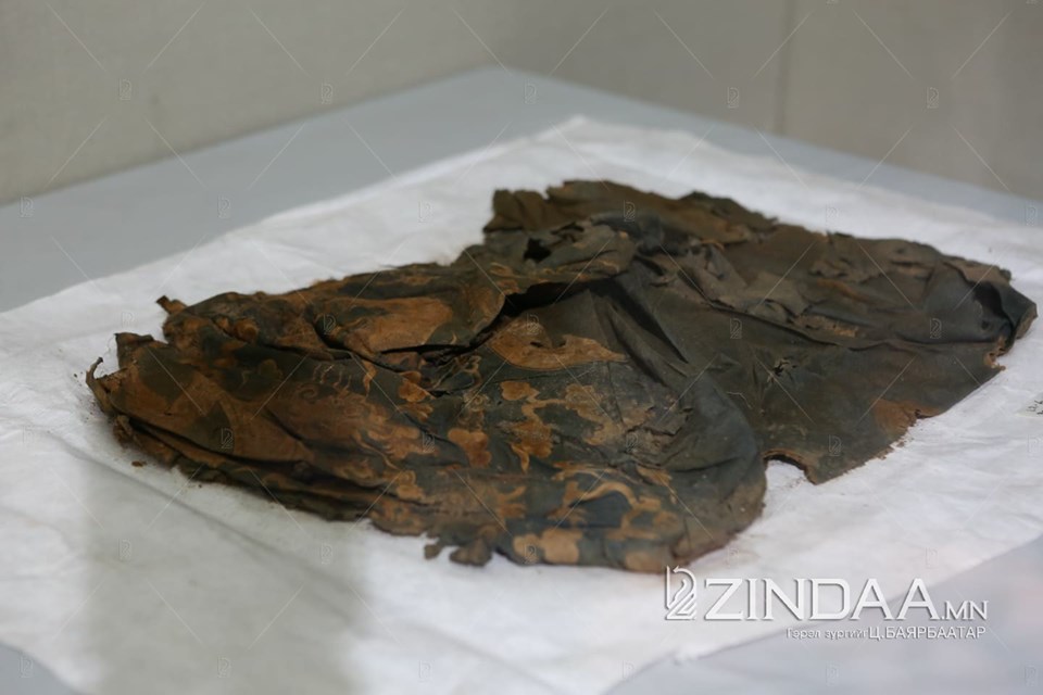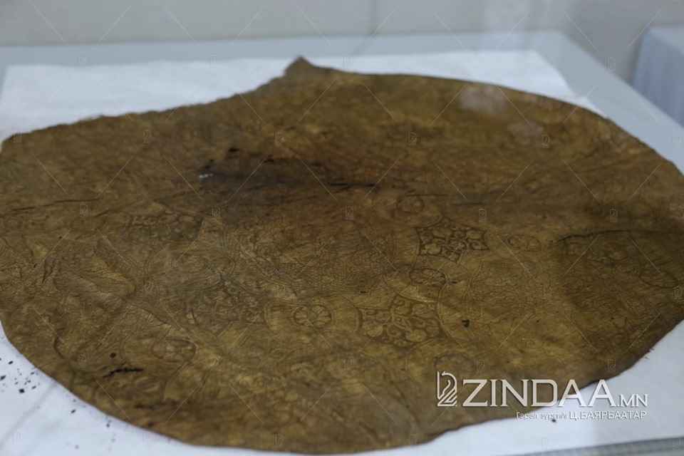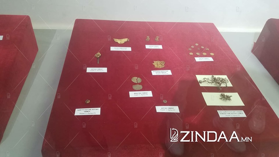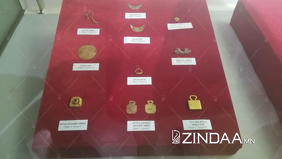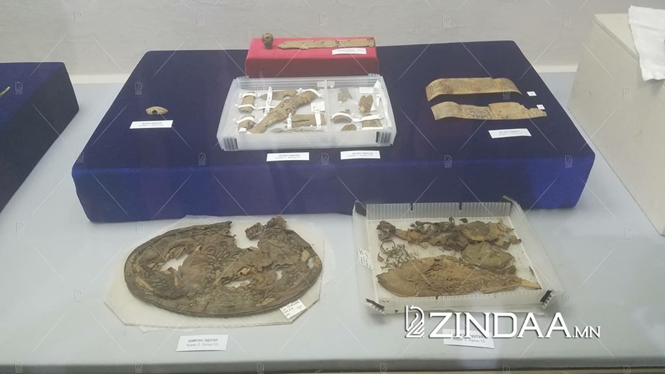 Тухайлбал, алтан нар, сарны дүрс, мөнгөн сарны дүрс, бурханы дүрстэй нимгэн алтан эдлэл, алтан ээмэг, бүсний алтан чимэглэл, дотроо торгонд баринтагласан эд зүйл өүхий ширэн хавтага, алтан утастай, хас, луу болон домгийн амьтдын дүрс хээтэй олон төрлийн торгон дээл хувцасны тасархай, ширэн гутлын хэсэг, нум, сумны зэв, саадаг, хоромсого, шаазан болон шавар ваар, ясан сойз, адуу малын тоног хэрэгсэл гэх мэт хэдэн зуун олдворуудыг дэлгэн үзүүлжээ.