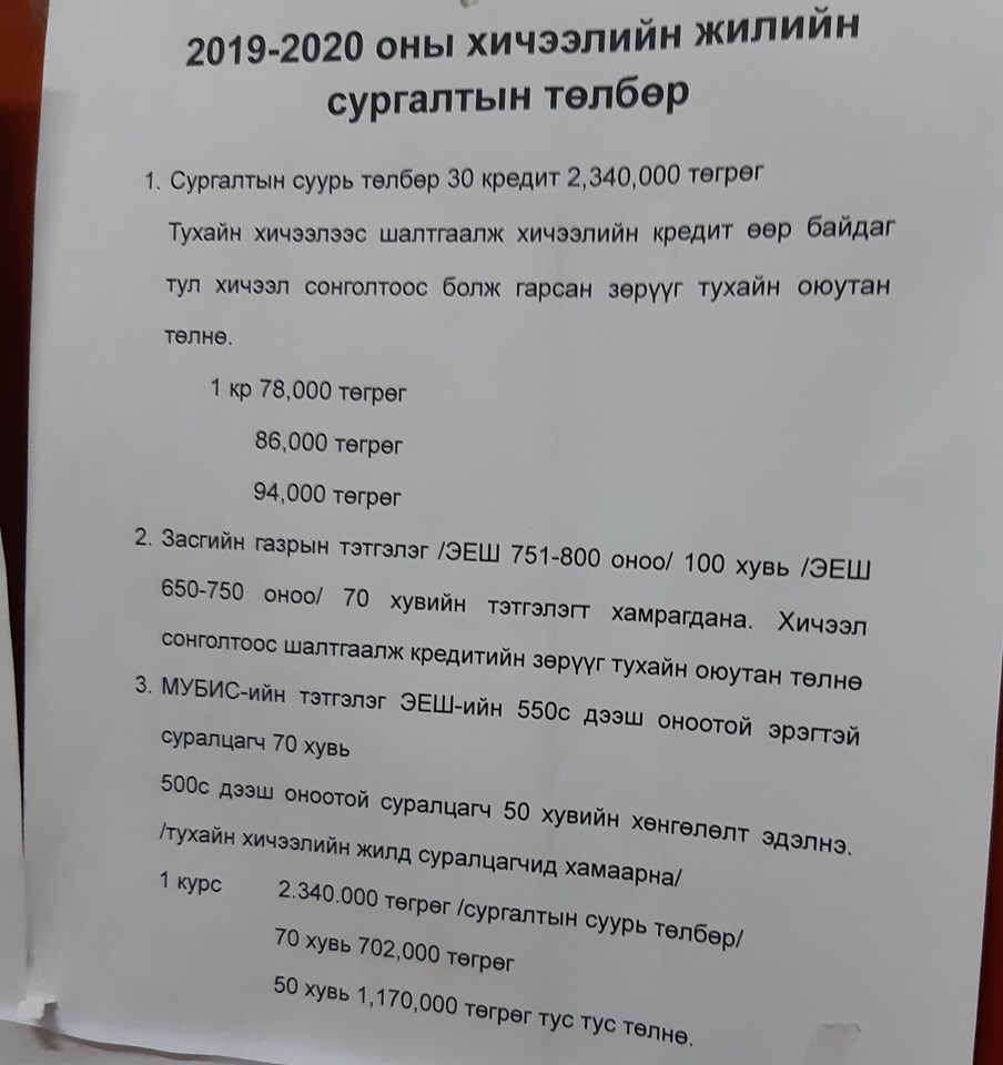 Манай сургууль дотроо таван бүрэлдэхүүн сургуультай. Нэгдүгээр курст ордог ерөнхий суурийн хичээлүүд бүгд адил нэг кредит нь 98.600 төгрөг байгаа. Хоёрдугаар курсээсээ буюу мэргэжлийн хичээл ороод эхэлбэл бүрэлдэхүүн сургуулиасаа хамаараад зөрүүтэй байдаг. Энэ нь юутай холбоотой вэ гэвэл тухайн үзэж буй хичээлийн хэрэглэгдэхүүн, сургалтын материал өөр өөр байдаг учраас харилцан адилгүй байдаг. Ерөнхийдөө нэг кредит 100.700-120.800 төгрөгийн хооронд байгаа” хэмээх мэдээллийг өглөө.