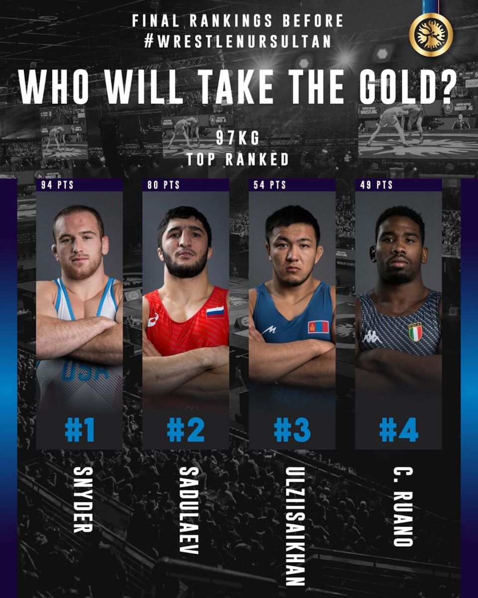 Манай бөхчүүдээс 97 кг-д Ө.Батзул ганцаараа хэсэг тэргүүлэх бөхчүүдийн тоонд багтсан. Ялаад явж байхад ОХУ-ын Абдулрашид Садулаевтай таарах магадлал өндөр. Энэ жинд АНУ-ын Кайл Снайдер чансааг тэргүүлж, Садулаевтай финалаас өмнө таарахгүй болжээ.