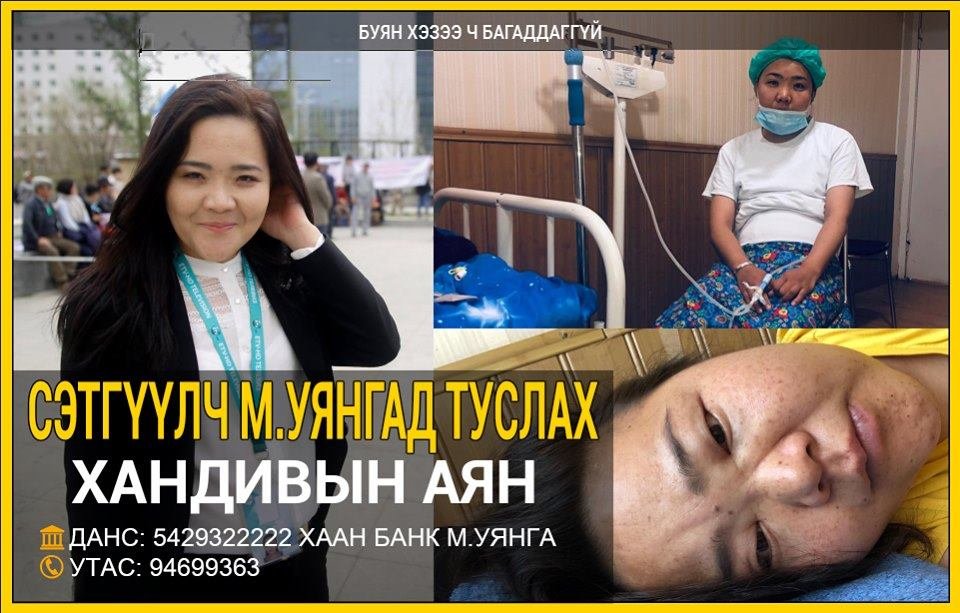 -Бөөр солиулах мэс ажилбарт ороход 120 сая төгрөгийн зардал шаардлагатай байгаа. Миний эхнэр “ETV” телевизийн мэдээний албанд таван жил гаруй ажиллаж байна. Үдэш бүр л ард түмэнтэйгээ цэнхэр дэлгэцээр уулздаг. Найз нөхөд, сэтгүүлч, уран бүтээлчдийн зүгээс хандивын аянг өрнүүлээд байна. 94699363, 99122471 дугаарт холбогдож хандивын аянд нэгдэж болно.