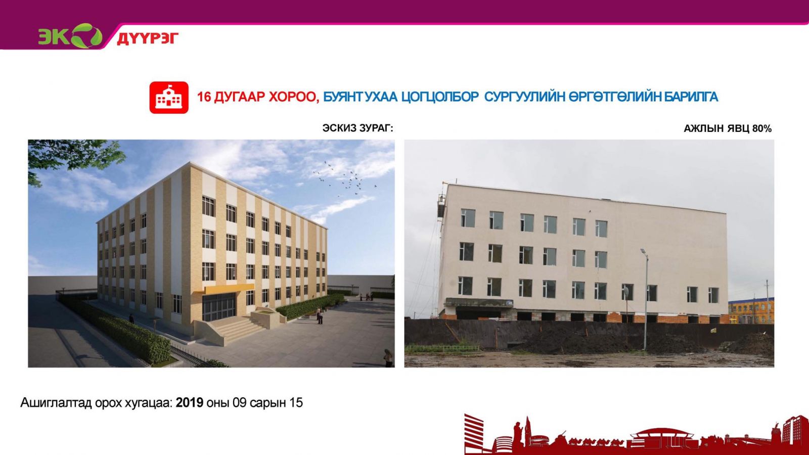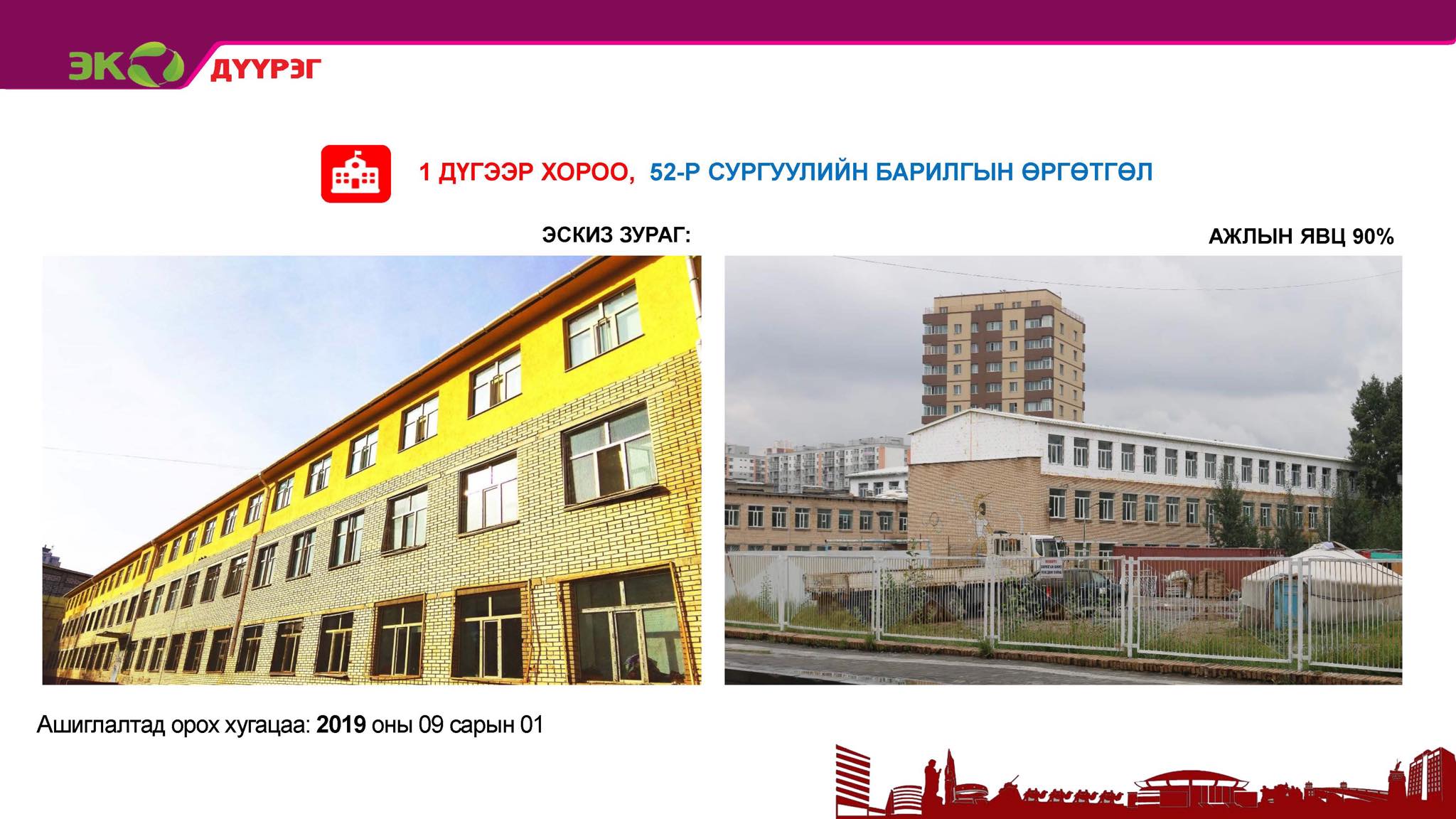 Хан-Уул дүүргийн хэмжээнд 2019-2020 оны хичээлийн шинэ жилд нийт 1280 суудлын хүчин чадалтай 52-р сургууль, "Буянт-Ухаа" цогцолбор сургууль, 114-р сургууль зэрэг гурван сургууль ашиглалтад орох ажээ. Ингэснээр дүүргийн хэмжээнд гурван ээлжээр хичээллэж байсан сургуулиуд хоёр ээлжээр хичээллэх боломжтой болох аж.