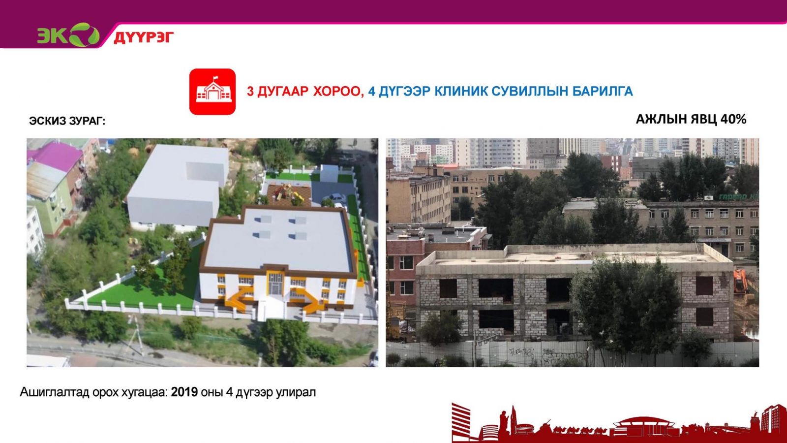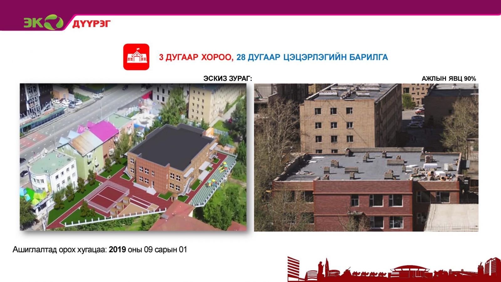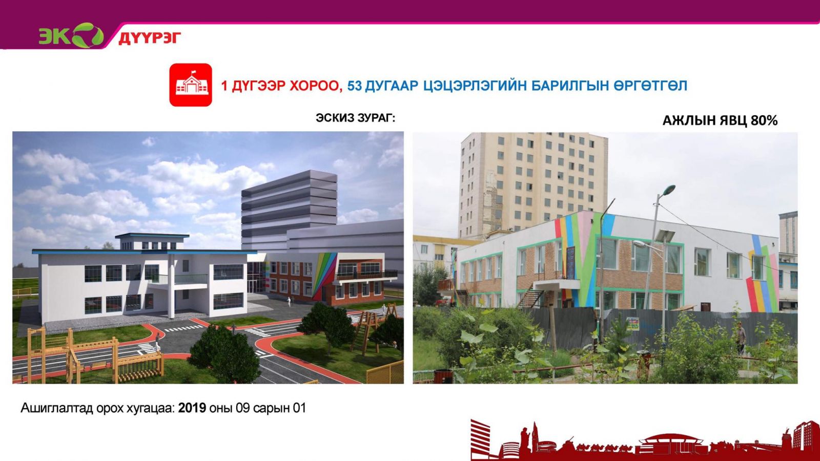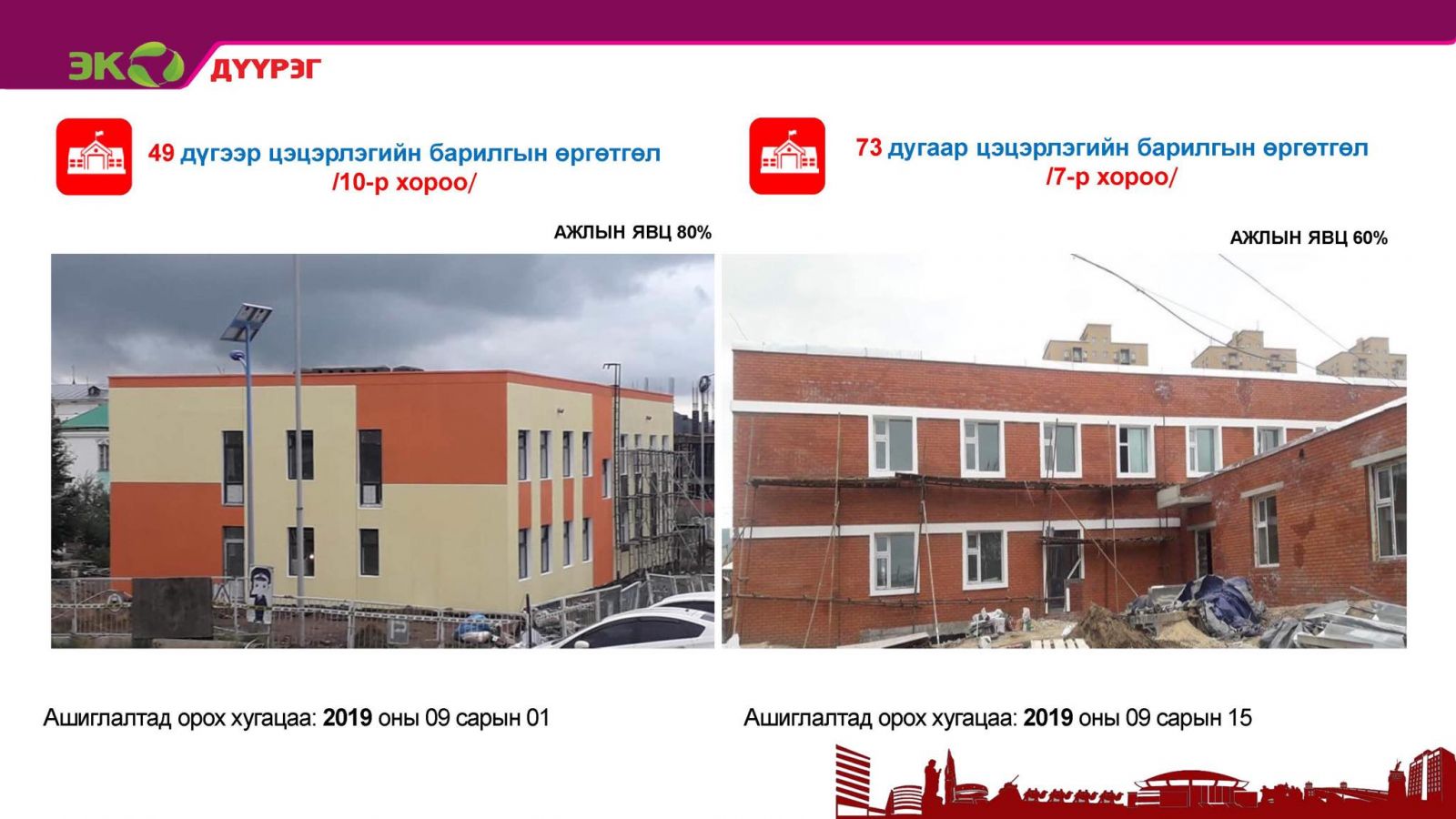 Түүнчлэн энэ хичээлийн жилд нийт 740 ортой хоёр цэцэрлэгийн барилга (4 дүгээр клиник сувилал, 28 дугаар цэцэрлэг), гурван цэцэрлэгийн өргөтгөл (49, 53, 73 дугаар цэцэрлэг)-ийг тус тус ашиглалтад оруулаад байна.