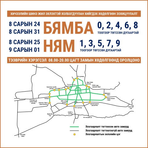 – Улсын дугаар нь ТЭГШ тоогоор 0, 2, 4, 6, 8-аар төгссөн автомашин наймдугаар сарын 31-ний бямба гарагт замын хөдөлгөөнд оролцоно.
