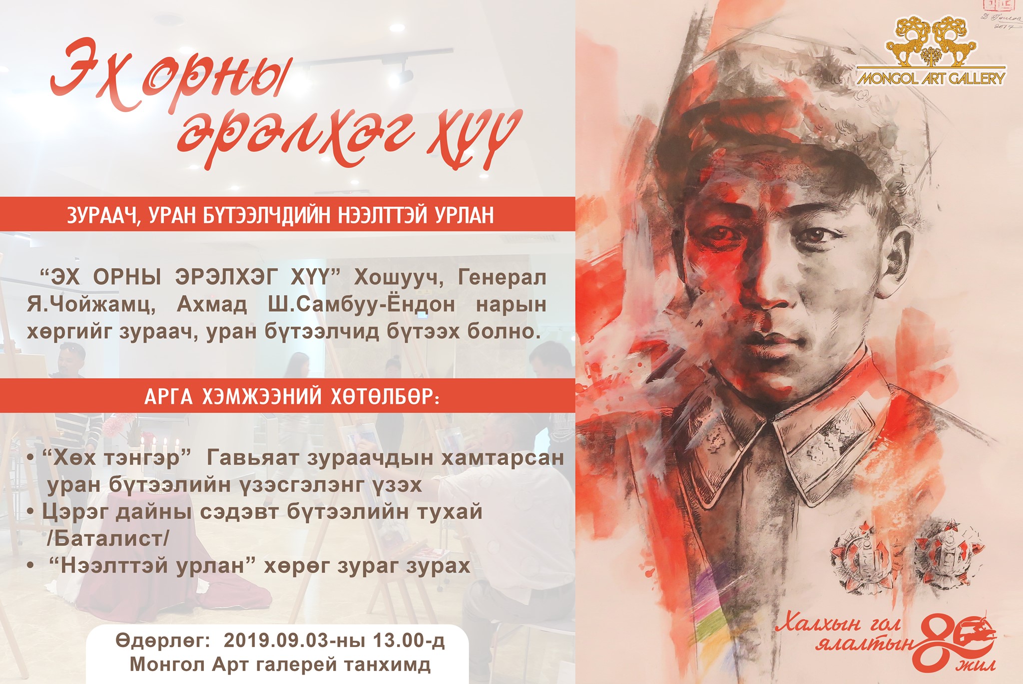 Дүрслэх урлагаар дамжуулан эх орончдоо алдаршуулах, тэдэнд хүндэтгэл үзүүлэхээр "Монгол арт" галерей зохион байгуулж буй зураач, уран бүтээлчид “ЭХ ОРНЫ ЭРЭЛХЭГ ХҮҮ” сэдвийн хүрээнд улс орондоо тодорхой гавьяа байгуулсан эрхэм хүмүүсийн хөргийг зурах арга хэмжээ болох аж.