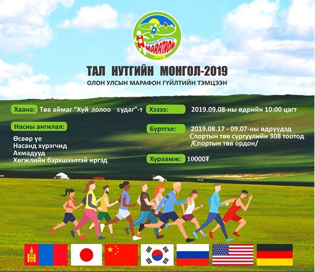 Монголын хөнгөн атлетикийн холбооны “Тал нутгийн Монгол” олон улсын марафон гүйлтийн 23 дахь удаагийн тэмцээн 2019 оны 09 дүгээр сарын 08-ны өдөр “ Хүй долоо худаг”-т, Өсвөр үе, Насанд хүрэгчид, Ахмадууд, Хөгжлийн бэрхшээлтэй иргэдийн дөрвөн үндсэн насны ангиллаар, 3км, 5км, 10км, 21км-ийн зайд зохион байгуулагдана.
