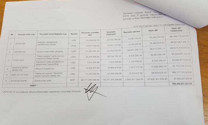 Монгол төрийн эрх ашиг хохирох нөхцөл байдал үүссэн учраас ЗГХЭГ-аас улсын Ерөнхий прокурор Б.Жаргалсайханд хандаж Хөгжлийн банкнаас их хэмжээний зээл аваад хугацаандаа төлөөгүй зургаан аж ахуйн нэгжийг шалгах хүсэлт өгснөө зарлалаа. Үүнд,