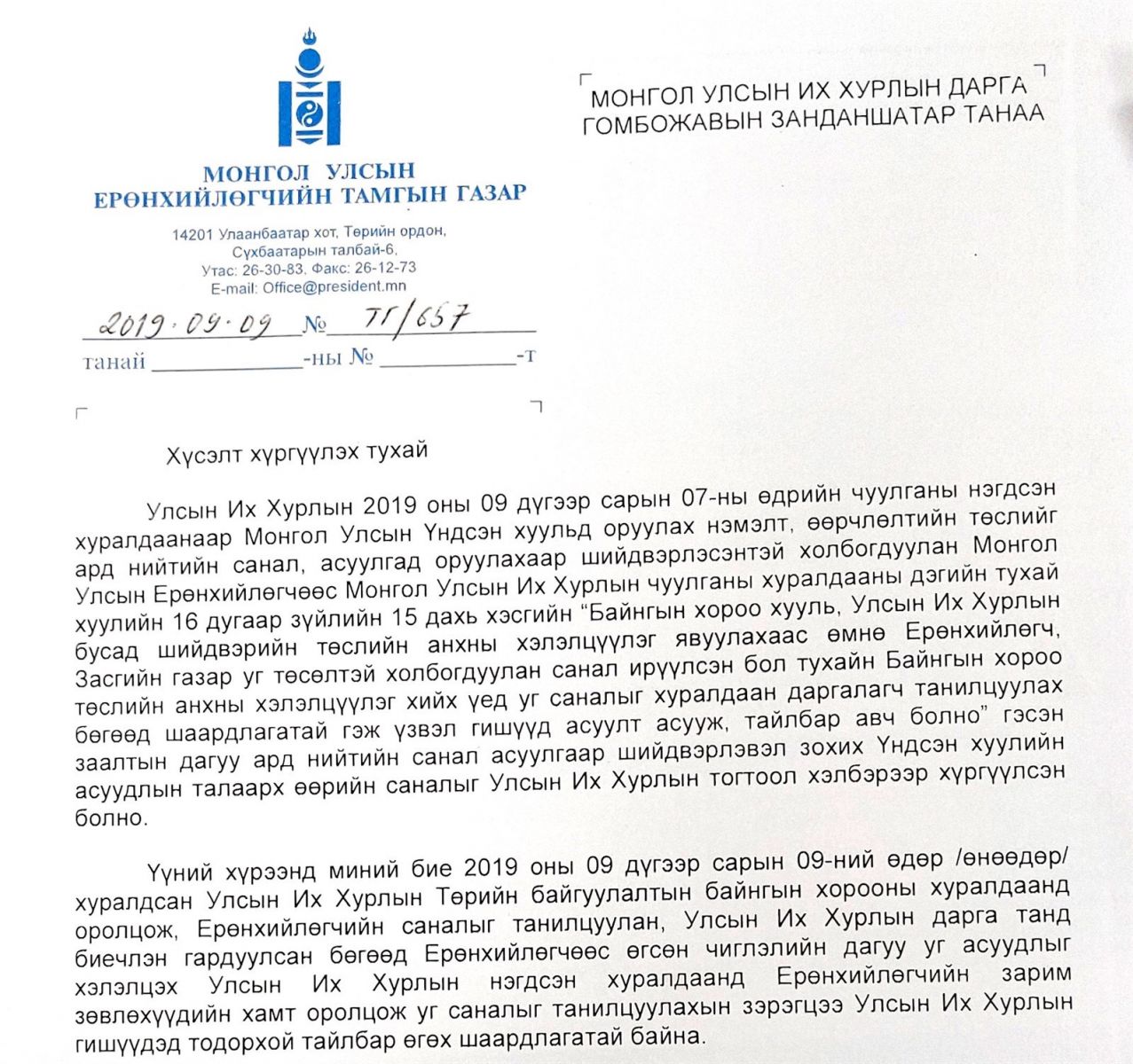 “Хүсэлт хүргүүлэх тухай” албан бичигт “Улсын Их Хурлын 2019 оны 09 дүгээр сарын 07-ны өдрийн чуулганы нэгдсэн хуралдаанаар Монгол Улсын Үндсэн хуульд оруулах нэмэлт, өөрчлөлтийн төслийг ард нийтийн санал асуулгад оруулахаар шийдвэрлэсэнтэй холбогдуулан Монгол Улсын Ерөнхийлөгчөөс Монгол Улсын Их Хурлын чуулганы хуралдааны дэгийн тухай хуулийн 16 дугаар зүйлийн 15 дахь хэсгийн “Байнгын хороо хууль, Улсын Их Хурлын бусад шийдвэрийн төслийн анхны хэлэлцүүлэг явуулахаас өмнө Ерөнхийлөгч, Засгийн газар уг төсөлтэй холбогдуулан санал ирүүлсэн бол тухайн Байнгын хороо төслийн анхны хэлэлцүүлэг хийх үед уг саналыг хуралдаан даргалагч танилцуулах бөгөөд шаардлагатай гэж үзвэл гишүүд асуулт асууж, тайлбар авч болно” гэсэн заалтын дагуу ард нийтийн санал асуулгаар шийдвэрлэвэл зохих Үндсэн хуулийн асуудлын талаарх өөрийн саналыг Улсын Их Хурлын тогтоол хэлбэрээр хүргүүлсэн болно.