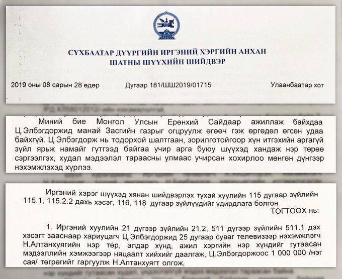 Тиймээс Н.Алтанхуяг би өөрөө өргөдлөө өгөх хэцүү байна, та огцруулаад өгөөч гэж над дээр орж ирсэн. Тэр өргөдлийг нь би нугалаад ийм зүйл байхгүй гээд буцаасан” хэмээн ярьсан билээ. Харин Ерөнхий сайд асан Н.Алтанхуяг Ц.Элбэгдоржийг худлаа ярилаа, хүн гүтгэсэн гэх үндэслэлээр шүүхэд өгсөн. Ерөөсөө хүүхэд хөгшдийн хэрүүл шиг юм болсон. Ийнхүү Ардчилсан намын лидерүүдын маргаан шүүх дээр чамгүй цаг хугацааны нүүр үзэсний эцэст нэгнээс нь нэг сая төгрөг авч нөгөөд нь өгөх шийдэлд хүрчээ. Тодотговол, Сүхбаатар дүүргийн иргэний хэргийн анхан шатны шүүхийн шийдвэр наймдугаар сарын 28-ны өдөр гарсан байна. Ингэхдээ “Иргэний хэрэг шүүхэд хянан шийдвэрлэх хууль”-ийг үндэслэн Н.Алтанхуягийн нэр төр, алдар хүнд, ажил хэргийн нэр хүндийг гутаасан мэдээллийн хэмжээгээр няцаалт хийхийг даалгаж, Ц.Элбэгдоржоос нэг сая төгрөгийг гаргуулан Н.Алтанхуягт олгуулах шийдвэр гарчээ. Нэгэн нам, нэгэн Засгийн газар, нэгэн парламент гээд улс төрийн адармаатай замд ганзага нийлүүлж явсан хоёр нөхөр нэгнээ шүүхэд өгөөд нөгөө нь нэхэмжлэхийн дагуу нэг сая төгрөг гаргуулаад нөгөө нь авах юм байх. Шүүхийн шийдвэр хүчин төгөлдөр байгаа хойно өгч авалцах нь ойлгомжтой хэрэг. Бүрэн улсын шүүхийн тогтоол шийдвэр шүү дээ.