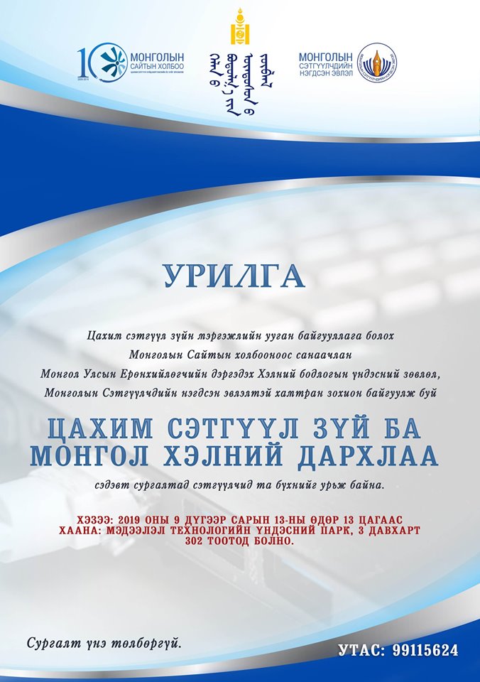 "Цахим сэтгүүл зүй ба монгол хэлний дархлаа" сэдэвт сургалт өнөөдөр Мэдээлэл, технологийн үндэсний паркийн гуравдугаар давхарт болно. Сэтгүүл зүйн салбарт зөв бичиж, зөв найруулах чадвар дутагдаж байгаа энэ үед цагаа олсон сургалт явуулж байгаа нь сэтгүүлчдэд өгөөжтэйгөөс гадна унаган монгол хэлээрээ алдаа мадаггүй бичиж занших нь бичгийн соёлын нэг хэлбэр билээ.